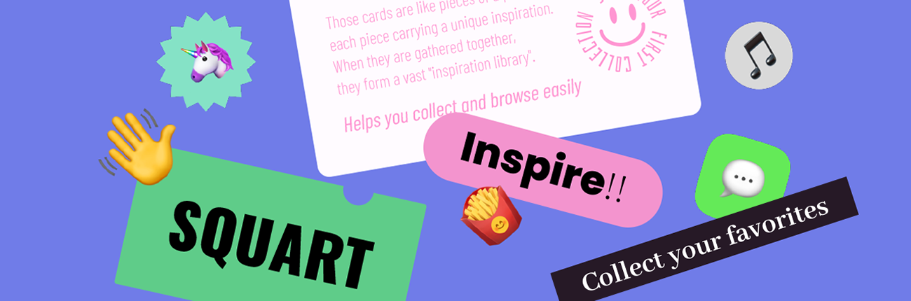 起初我想起了“Square”这个词,它的意思是方形、广场…,恰好与我们日常浏览的方块卡片一样。当这些卡片汇聚在一起时,它们便成为了我们灵感的碎片,随着时间的积累,逐渐形成了一个“大的收藏夹”……“mood board”,并长久下来形成一个“灵感库”,这不仅是收藏的乐趣,更是一种积累艺术。因此,我将“Square”和“Art”进行结合,造了个“Squart”这个名字,意为灵感的聚集之地。作为一个有趣的谐音梗,我们甚至可以亲切地称它为“丝瓜”。